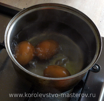 Варим яйцо - 3 шт. 8 минут на медленном или среднем огне, чтобы оно не лопнуло.