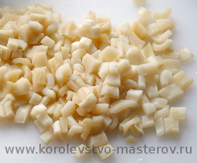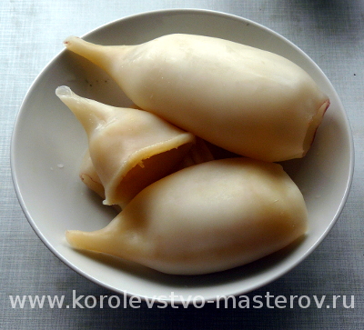 У кальмаров есть одна маленькая неприятная особенность, внутренняя кожица, жёсткая и прочная. Чистить её можно пару часов, на что у меня порой не хватает никакого терпения, а кальмаров я люблю. Здесь есть небольшой секрет, нужно просто мелко покрошить тушку кальмара и кожица станет почти не заметна во время еды :)