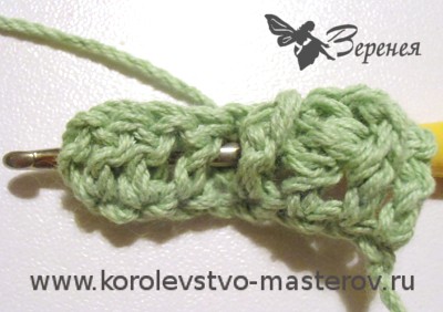 Подхватить рабочую нить и протянуть её через две оставшиеся на крючке петли.