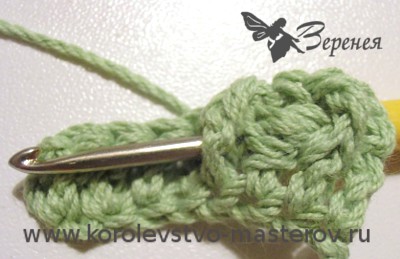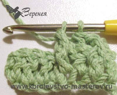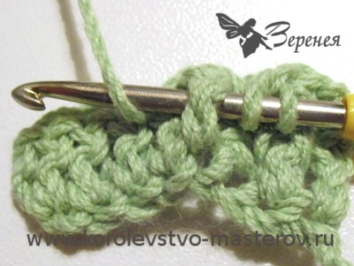 Рельефный изнаночный столбикВыполнение рельефного изнаночного (западающего) столбика - захват рабочей нити перед работой. Крючок обвивает столбик предыдущего ряда сзади (крючок вводится не за петлю основания, не за переднюю стенку, не за заднюю стенку), вытягивается петля и вывязывается столбик с накидом. Во время захвата столбик предыдущего ряда оказывается позади крючка (ниже крючка).