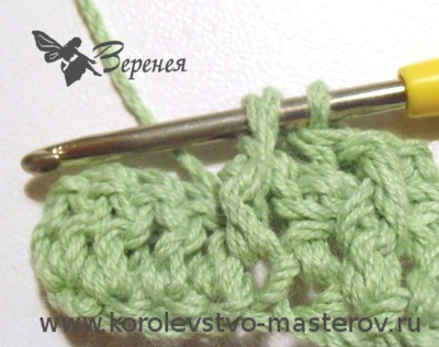 Лицевой рельефный столбикВыполнение рельефного лицевого (выступающего) столбика - захват рабочей нити перед работой. Крючок обвивает столбик предыдущего ряда спереди (крючок вводится не за петлю основания, не за переднюю стенку, не за заднюю стенку), вытягивается петля и вывязывается столбик с накидом. Во время захвата столбик предыдущего ряда оказывается перед крючком (выше крючка).
