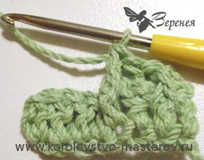 Рельефный изнаночный столбикВыполнение рельефного изнаночного (западающего) столбика - захват рабочей нити перед работой. Крючок обвивает столбик предыдущего ряда сзади (крючок вводится не за петлю основания, не за переднюю стенку, не за заднюю стенку), вытягивается петля и вывязывается столбик с накидом. Во время захвата столбик предыдущего ряда оказывается позади крючка (ниже крючка).