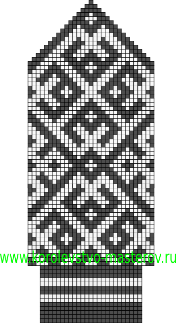 Схема для вязания спицами варежек с орнаментом по мотивам северных узоров.