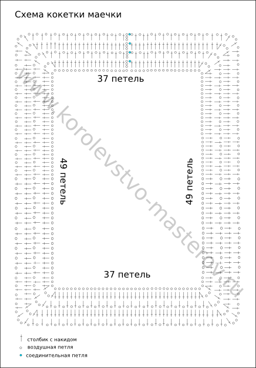 Провязать по схеме кокетки девять рядов. Затем сложить кокетку пополам (по плечевым швам) и продолжить вязать по кругу только перед и спинку.