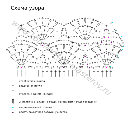 Последний ряд: 3 воздушные петли, столбик без накида в арку (под 2 воздушные петли).