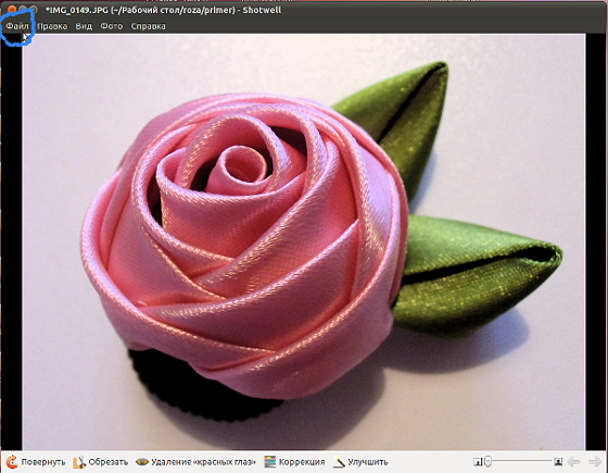 Наводим на файл изображения фотографии и кликаем один раз правой клавишей мыши. Выбираем "Открыть в программе", далее выбираем "Просмотрщик фото Shotwell". Открывается такое окно: