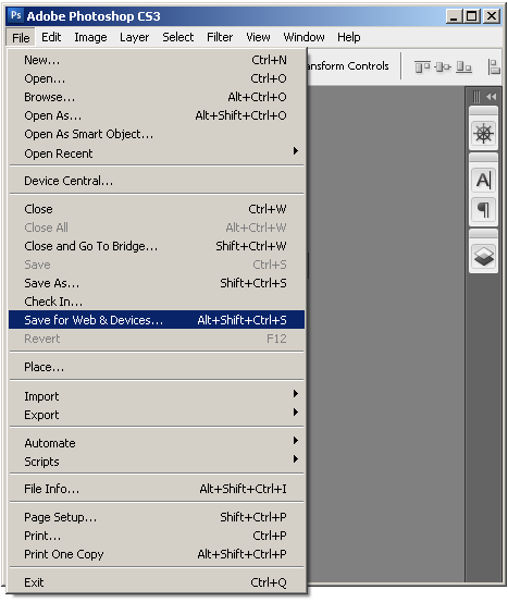 File -> Save for Web & Devices ... или жмем одновременно клавиши