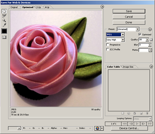 Quality: 80 , если получится очень плохое качество то можно поднять до 90, но скорее всего разницы вы не заметите, по крайней мере на сайте.