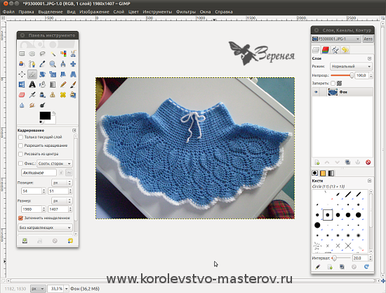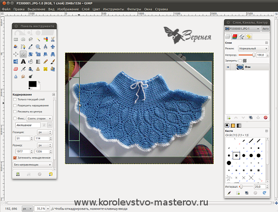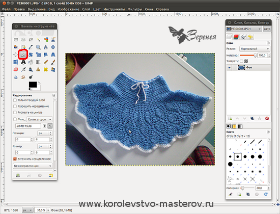 Выбираем инструмент "Кадрирование" (похож на острие макетного ножика). Для этого нажимаем на него левой клавишей мыши. В черной прямоугольной области надпись подсказывающая нам что это: "Кадрирование: удаление областей с края изображения или слоя".