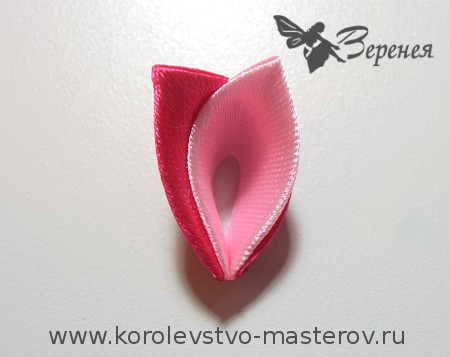 Отрезаем от атласной ленты два квадрата 5 х 5 см. Складываем квадраты по диагонали. Затем еще раз по диагонали. Двойной лепесток делается по технологии как делается простой острый лепесток:
