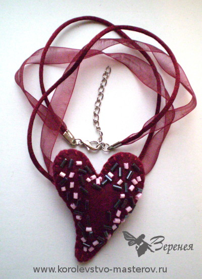 Если через крепление для булавки протянуть шнурок брошь трансформируется в колье «Валентинка».