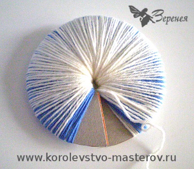 Затем нитку, находящуюся между кругов картона, крепко завязать узлом. Для прочности желательно сделать несколько узлов.
