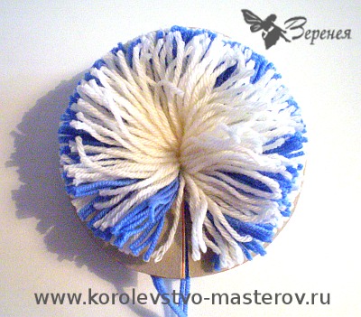 Далее аккуратно удаляем картон. Встряхиваем помпон и подравниваем с помощью ножниц.