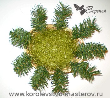 Втыкаем получившиеся елочные дротики по периметру пенопласта.