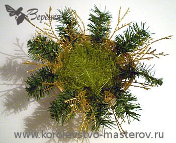 Маскируем донышко сизалью. Замаскировать донышко сизалью удобнее до того, как разместили елочные дротики. Я это сделала после - чтобы было видно как я втыкала елочные дротики.
