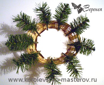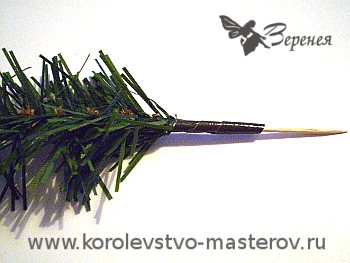 Когда клей чуть-чуть остынет, но не затвердеет полностью, пальцами прижимаем елочные иголочки.